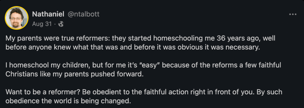 I was homeschooled from second grade through senior year of high school. Like Nathaniel, I’m so glad for my parents’ example in pursuing what they believed to be right in spite of its being an uphill effort. It looks increasingly like the future is going to bring some more pioneering work for Christians, and I’m very grateful to have my parents’ example and foundation to build upon!
