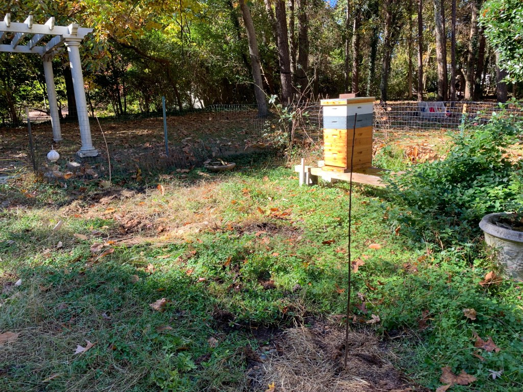 Asher and I started the spring with two new bee hives. Our hives fluctuated up and down, and we are now left with neither of our original hives, but only the feral hive captured by a friend which, I suspect, robbed our two other hives. You can also just make out my two new apple trees: